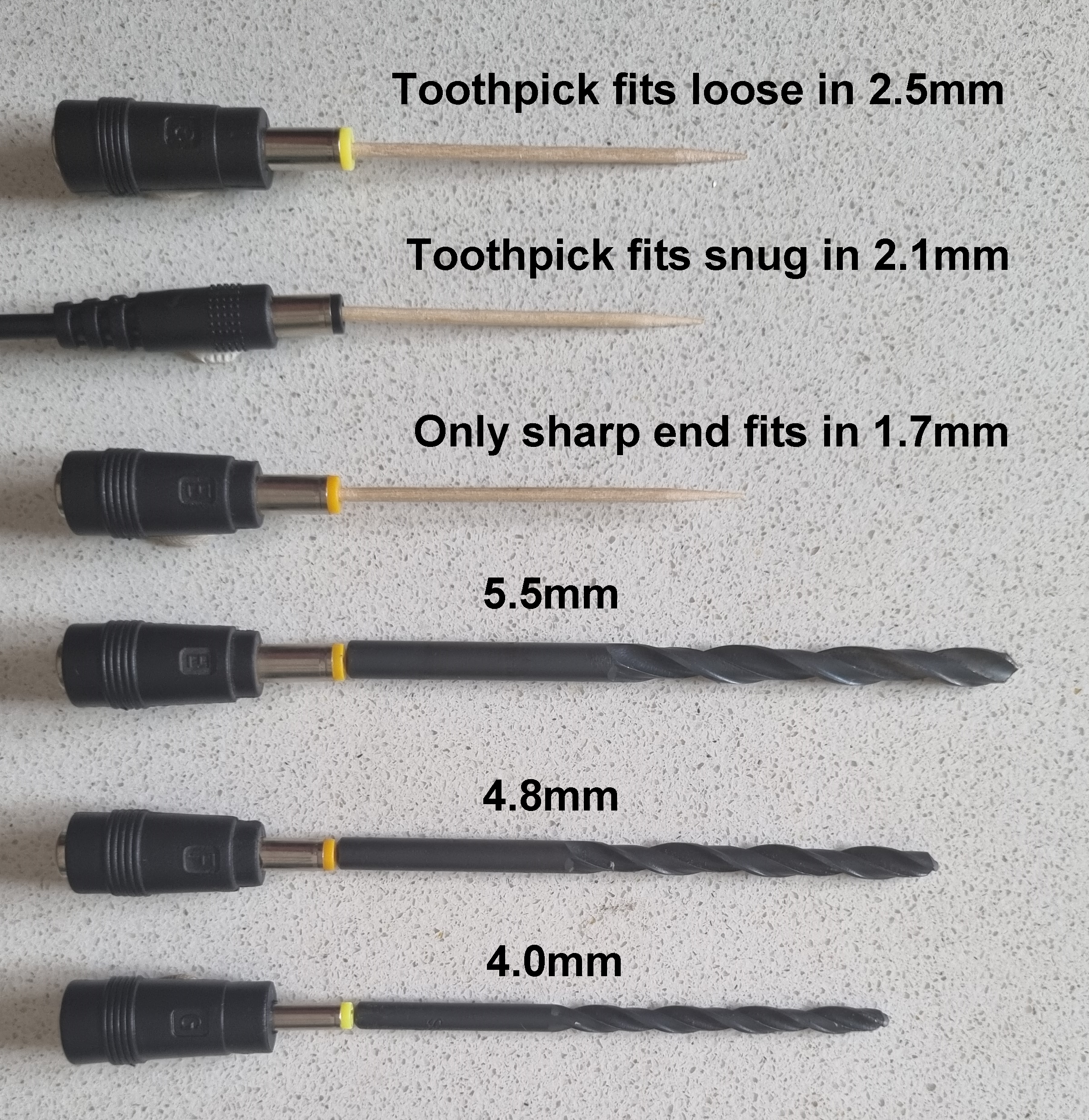 You can use a drill bit and toothpick to estimate you DC connector requirements.