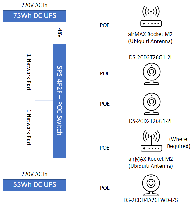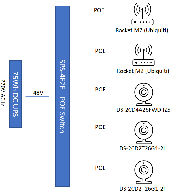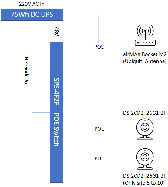 | Location | Rocket M2 | Switch - SPS-4F2F | DS-2CDD4A26FWD-IZS | DS-2CD2T26G1-2I | POE Injector | Solution |